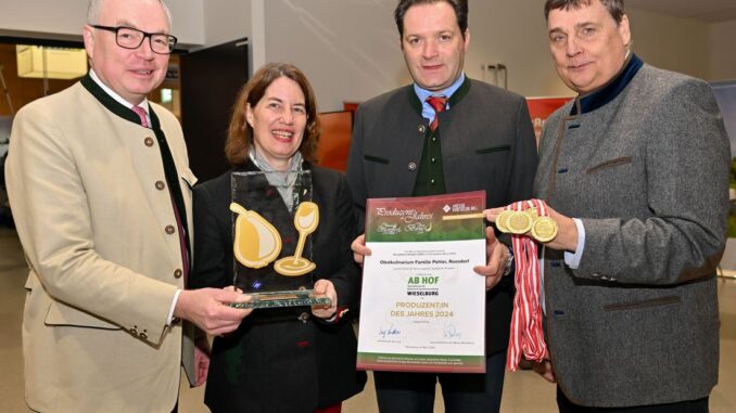 Der Familienbetrieb Pohler aus Raasdorf holte nicht nur den Hauptreis „Produzent des Jahres“, sondern auch noch vier weitere Goldmedaillen (v.l.): LH-Stellvertreter Stephan Pernkopf, Margarete Pohler, Landwirtschaftsminister Norbert Totschnig und Wilhelm Pohler. © NLK Filzwieser