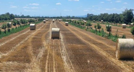 Wir testen auf diesem Feld ein Miteinander von Baumreihen (Mandeln), unseren Feldfrüchten und Weide. Bei den zunehmend heißen und trockenen Sommern kann dieses System viele Vorteile bieten. Weniger Wind, mehr Tau, Schatten für die Weidetiere, Refugium für Insekten und Vögel, CO2 Speicherung und Ernte von Mandeln.