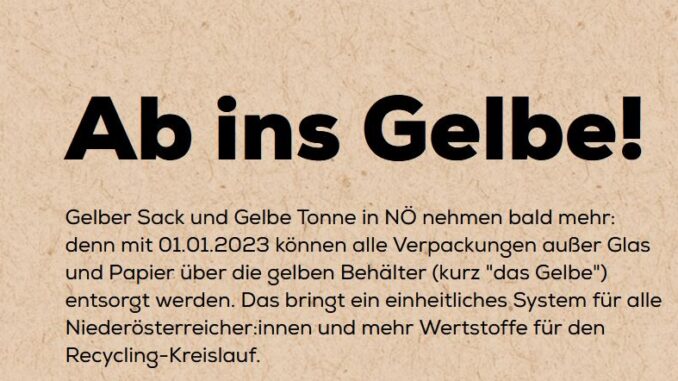 Das Land und die NÖ Umweltverbände werden die Bürgerinnen und Bürger in einer umfangreichen Kampagne mit dem Motto „Ab ins Gelbe!“ über die Umstellung und die damit einhergehenden Neuerungen informieren. Schon jetzt findet man Antworten auf die wichtigsten Fragen auf www.insGelbe.at.