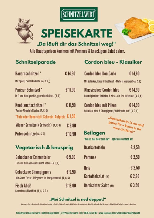 Regionale Schmankerl, Weine & Herzlichkeit aus Bad Pirawart „Mei Schnitzel is ned deppat!" Kommt vorbei, schnappt euch ein Schnitzel oder ein anderes Schmankerln und genießt die gemütliche Stimmung. Wir freuen uns auf euch!
