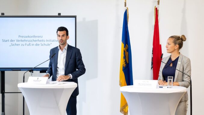 Am Donnerstag stellte LH-Stellvertreter Udo Landbauer gemeinsam mit Susanna Hauptmann, Geschäftsführerin von Radland Niederösterreich, die neue Verkehrssicherheitsinitiative „Zu Fuß in die Schule“ bei einer Pressekonferenz vor. Neben Infofoldern werden 34.000 reflektierende Textilsticker an Schulkinder der ersten beiden Schulstufen ausgeteilt.
