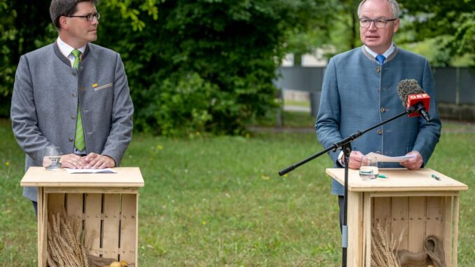 Landwirtschaftskammer NÖ Vizepräsident Lorenz Mayr und LH-Stellvertreter Stephan Pernkopf bei der Pressekonferenz. © NLK Filzwieser
