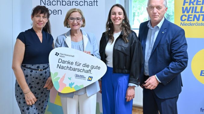 Das Land Niederösterreich wolle die Nachbarschaft mit mehreren Initiativen stärken, kündigte die Landeshauptfrau an: „Erstens starten wir eine Best-Practice-Plattform mit Anregungen zur Stärkung der Nachbarschaft unter dem Titel ,Nachbarschaft leben‘. Zweitens erweitern wir unser bisheriges Service für Freiwillige um Unterstützungsleistungen für das informelle Freiwilligenwesen im neuen Freiwilligencenter Niederösterreich, das in Schloss Atzenbrugg beheimatet ist, und drittens wollen wir den ,Tag der Nachbarschaft“ in Niederösterreich einführen, und zwar heuer am 31. Mai.“