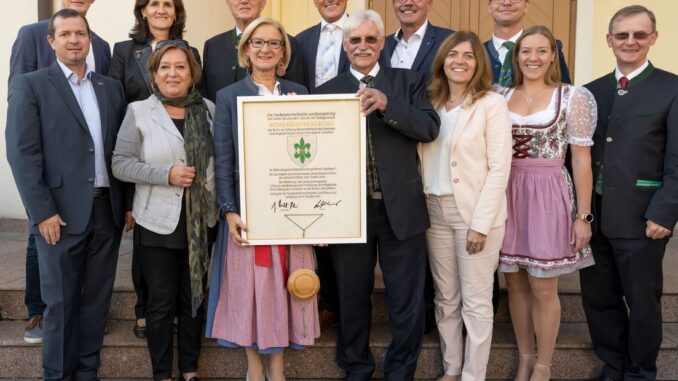 „In Silber eine grüne Doppellilie mit goldenem Querband“ – so lautet die Beschreibung des Gemeindewappens von Hohenruppersdorf. Der entsprechende Beschluss war am 1. Juni 2021 von der Niederösterreichischen Landesregierung getroffen worden, am gestrigen Samstag fand nun die offizielle Verleihung des Gemeindewappens durch Landeshauptfrau Johanna Mikl-Leitner statt.